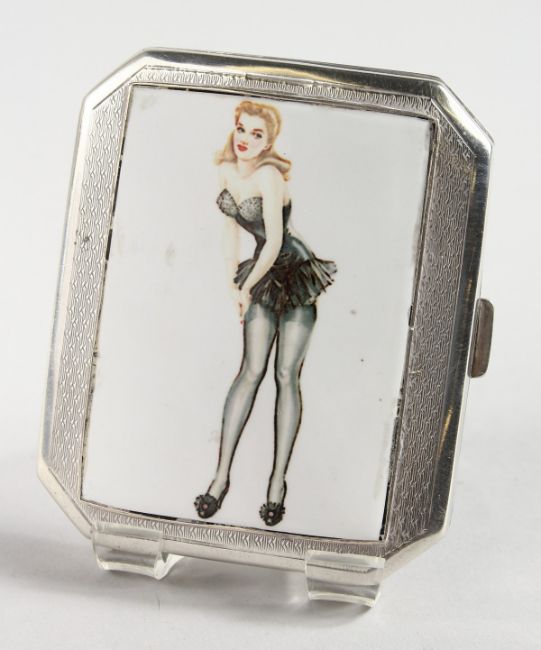 AN ENGINE TURNED SILVER CIGARETTE CASE, with an oval of a glamour model in a black lace dress.