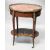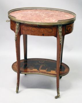 TOPOLINO, ITALY, A GOOD KINGWOOD, ORMOLU AND MARQUETRY OVAL OCCASIONAL TABLE, with brass galleried rouge marble top, over a small pull-out slide, a drawer to each end, with slender legs united by an undertier inlaid with a vase of flowers, bottles and vases.