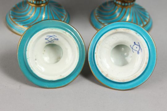 A VERY GOOD PAIR OF 19TH CENTURY SEVRES BLUE VASES AND COVERS, with masks and reverse panels of a lake scenes and figures.
