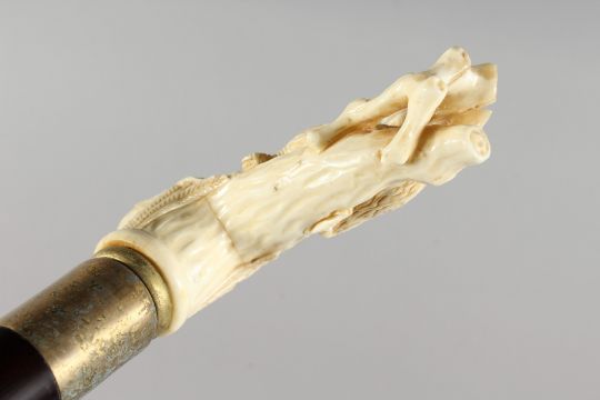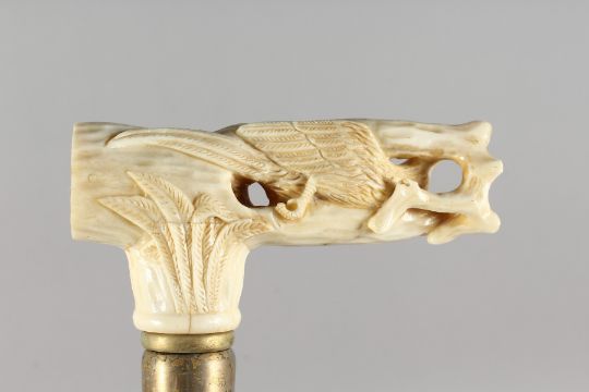 A WALKING STICK, the bone handle carved as a bird on a branch.