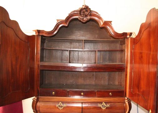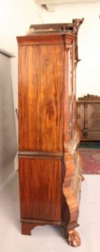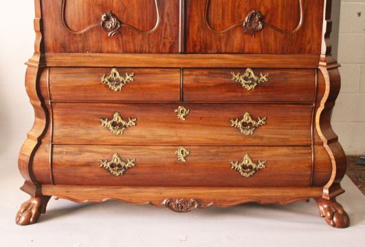 AN 18TH CENTURY DUTCH MAHOGANY BOMBE CUPBOARD, with shell carved arched cornice, pair of panelled doors enclosing shelves and five drawers, the bombe base with two short and two long drawers on claw and ball feet.