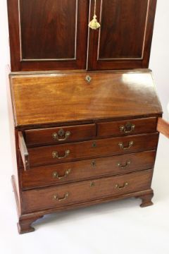 A GEORGE III MAHOGANY BUREAU/CUPBOARD BOOKCASE, with a moulded cornice over a pair of panelled doors enclosing three adjustable shelves and four small drawers, the slope enclosing a small cupboard, drawers and pigeonholes over two short and three graduated long drawers, on ogee bracket feet.