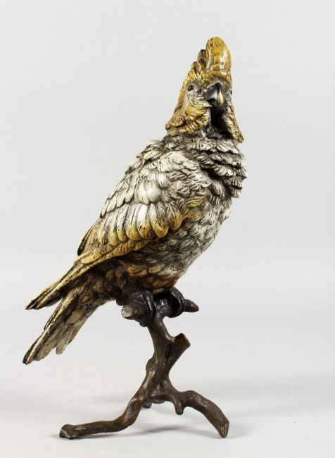 A VIENNA STYLE COLD PAINTED BRONZE OF A PARROT ON A BRANCH.