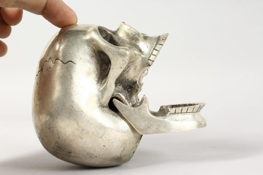 A PLATED METAL MODEL OF A HUMAN SKULL.