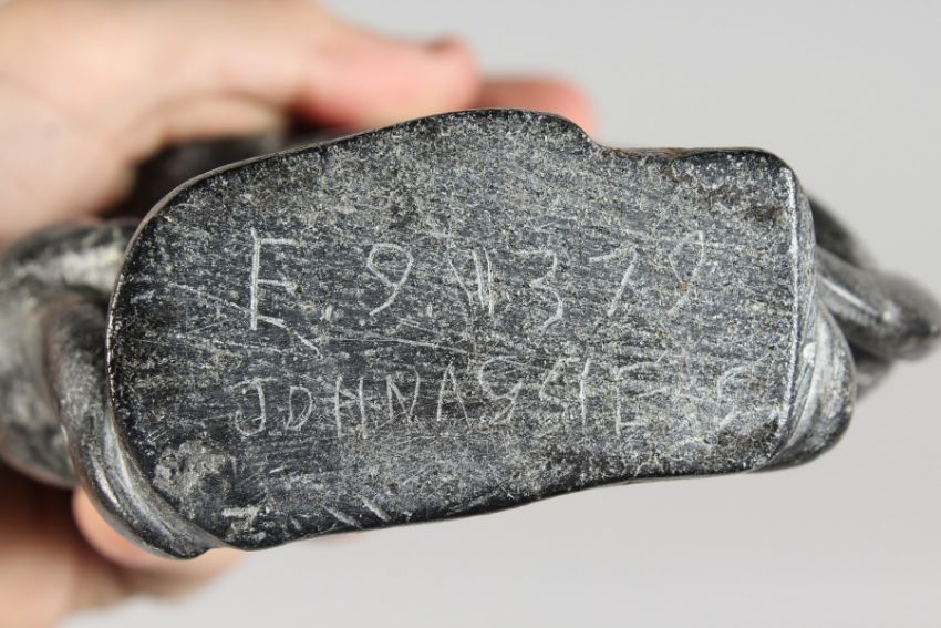 AN INUIT CARVED HARDSTONE FIGURE OF AN ESKIMO.