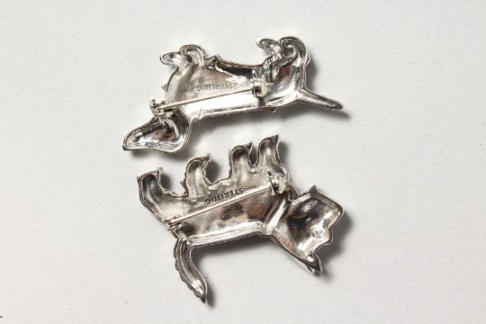 TWO SILVER GEM SET DOG BROOCHES.