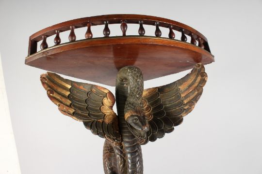 A GOOD UNUSUAL PAIR OF 19TH CENTURY MAHOGANY CORNER WALL SHELVES, the galleried tops supported by carved, painted and gilded winged serpents.