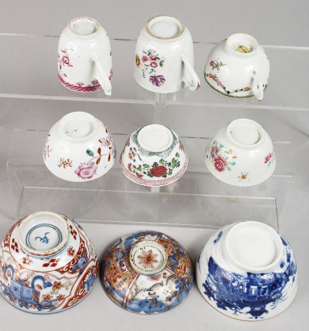AN 18TH CENTURY CHINESE ARMORIAL TEA BOWL, with gold line crest and a Chinese tea cup with a crest having a bird W U and two dolphins, two polychrome coffee cups and two polychrome tea bowls, a blue and white bowl and a Chinese Dutch decorated bowl and matched cover.