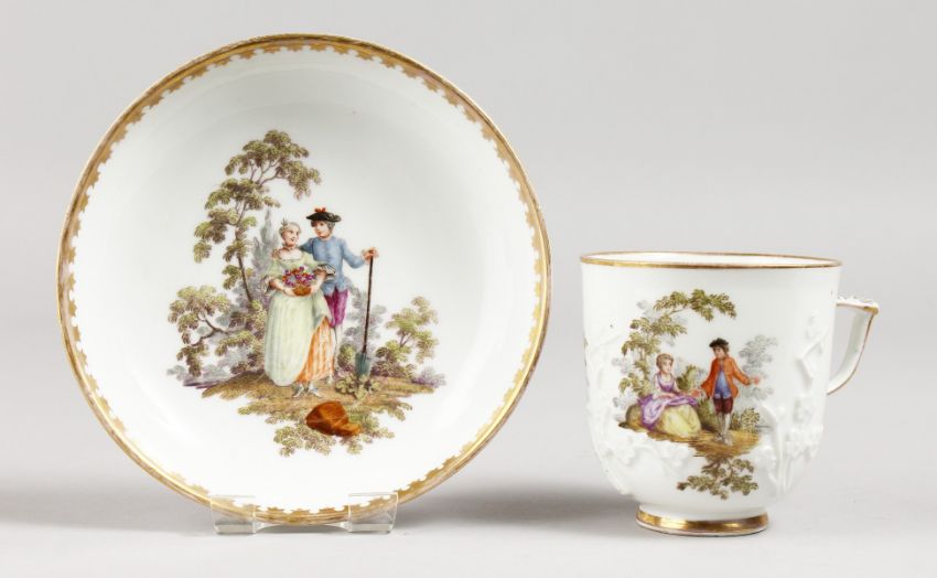 A MEISSEN COFFEE CUP AND SAUCER, prunus moulded ad painted with scenes of a courting couple.