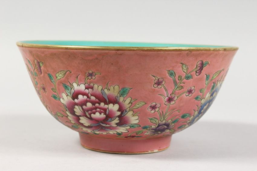 A CHINESE PORCELAIN BOWL, pink ground painted with flowers.