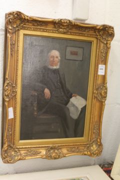 A portrait of an elderly gentleman seated in a chair oil on canvas in a decorative gilt frame.