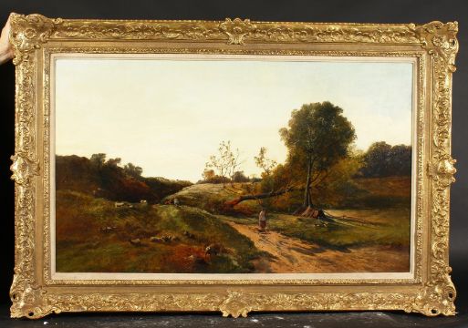 Charles Leslie (1839-1886) British. Wayfarers on a Country Lane with Sheep Grazing, Oil on Canvas, Signed and Bears Label Verso, 24" x 40".