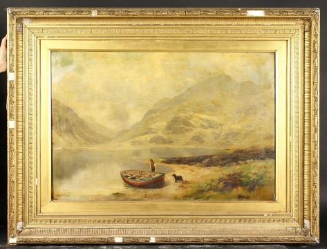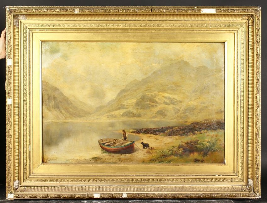 James Henry Crossland (1852-1939) British, A loch scene, with a man and his dog beside a rowing boat, oil on canvas, signed, 24"x 36".