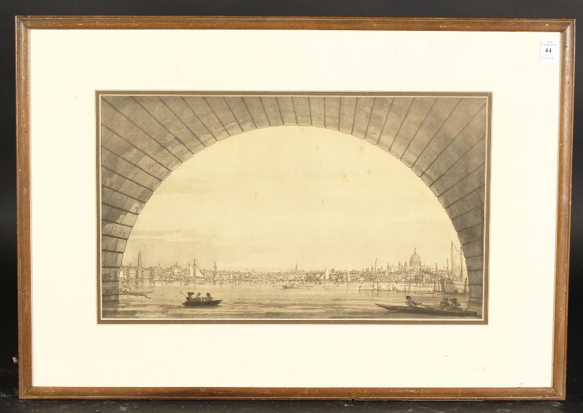 After Canaletto. London, the city seen through the arch of Westminster Bridge, 11" x 18".