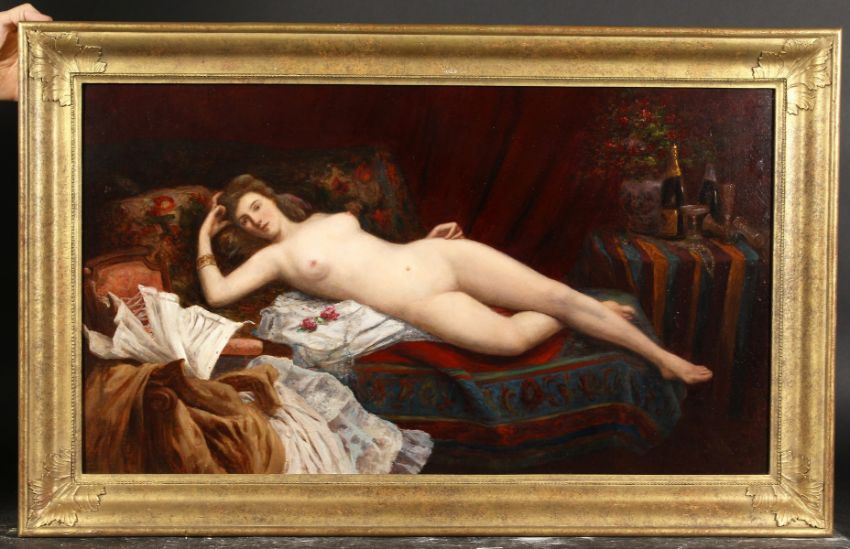 Jules Scalbert (b. 1851) French, a reclining female nude in a boudoir, oil on canvas indistinctly signed, 18" x 32".