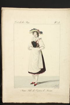 A collection of seven 19th century Swiss hand coloured prints of regional costumes, two of them 10" x 7" and five of them 12" x 8", unframed (7).
