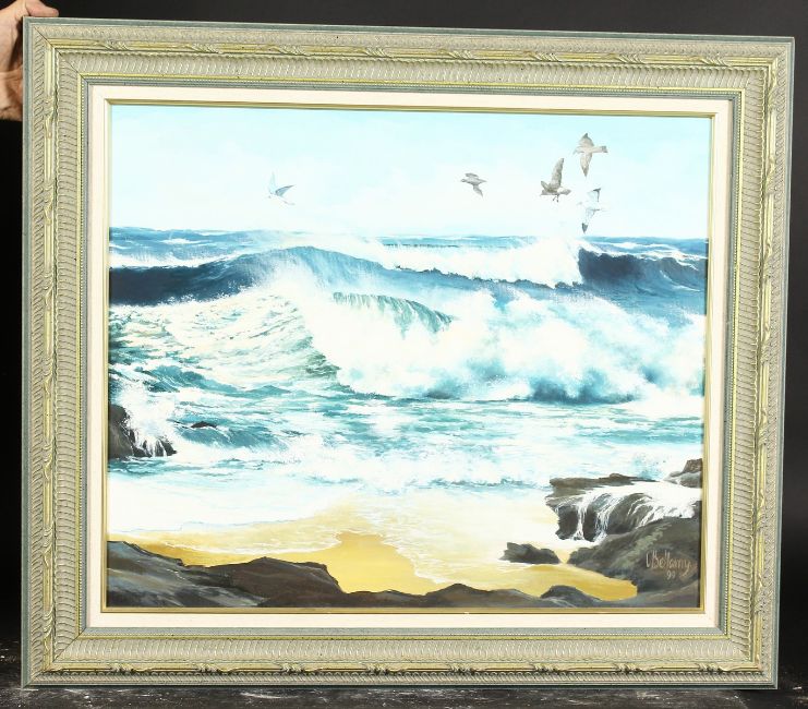 David Bellamy (20th century) British, 'Seagulls and Surf', A scene of birds flying over breaking waves, oil on canvas, signed and inscribed verso, 20"x24. "