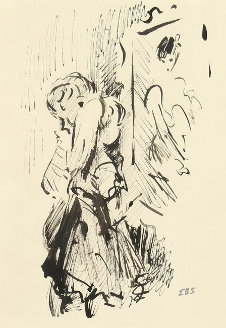 Elinor Bellingham-Smith (1906-1988) British. A Study of Two Children regarding a Painting, Ink. 8.5" x 6".