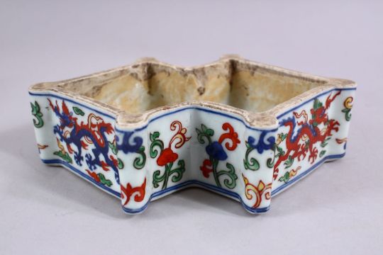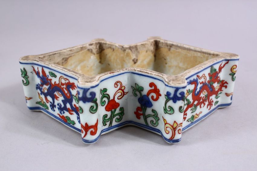 A CHINESE WUCAI DECORATED PORCELAIN DRAGON BOX, decorated with scenes of a dragons chasing the pearl, the base with a six character mark, 18cm wide.