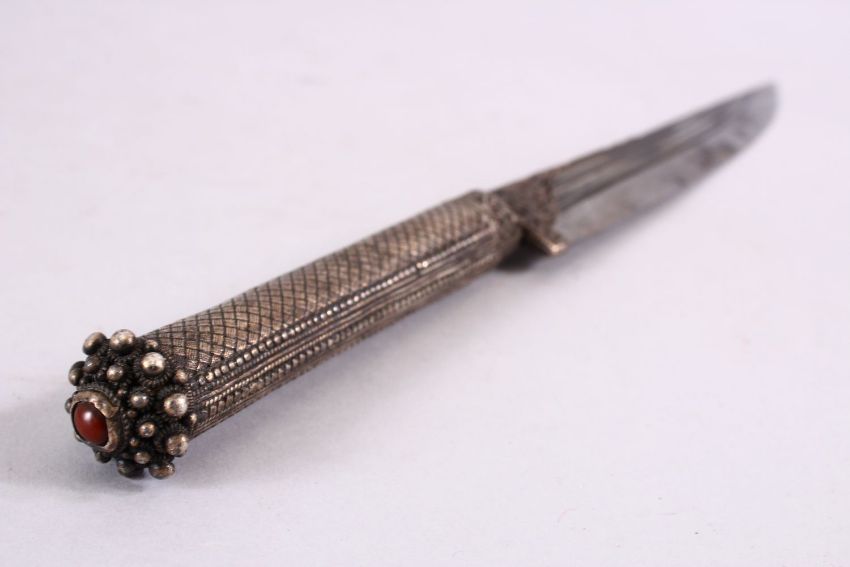 AN 18TH CENTURY OTTOMAN FINE SILVER WORK HANDLED SULTANS HANCER / DAGGER, with silver filigree style work, the top inset with a ruby or ruby like stone, 33.5cm.