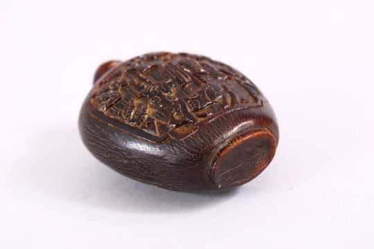 A 19TH CENTURY CHINESE CARVED HORN SNUFF BOTTLE, carved with scenes of an immortal with deer, in landscape scene, 7.2cm