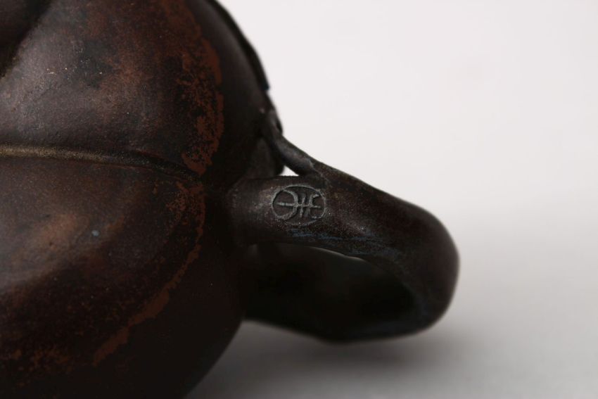 A GOOD QUALITY CHINESE YIXING CLAY MINIATURE TEA POT & COVER, moulded in the form of a pumpkin, bamboo form handle with foliage, underside of lid with double seal mark, 5cm high x 10cm wide,