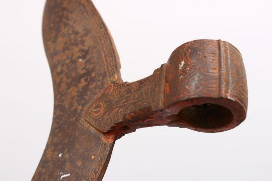 A LARGE 17TH / 18TH CENTURY SOUTH INDIAN STEEL AXE HEAD, with carved floral decoration, 32cm