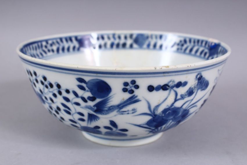 TWO 18TH / 19TH CENTURY CHINESE BLUE & WHITE PORCELAIN BOWLS, the larger with decoration depicting figures in landscape views with hairline, the smaller one repaired, depicting birds amongst native flora and fruit, the base with a four character Kangxi mark, 20cm & 18cm.