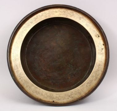 A GOOD CHINESE PAKTONG METAL ALLOY BASIN, carved with prunus decoration and a view of a landscape, 36cm.