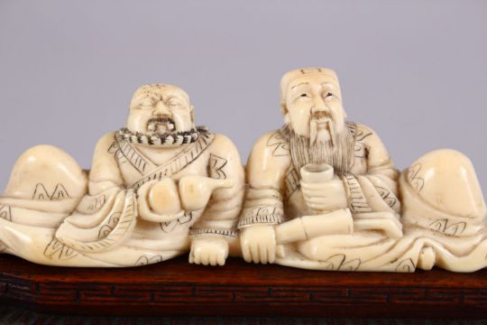 AN EARLY 20TH CENTURY CHINESE CARVED IVORY FIGURE OF TWO DRINKING MEN, both men seated drinking from a double gourd vessel, upon a carved hardwood base, 11cm wide.