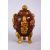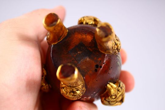 A CHINESE PEKING GILT MOUNTED PAINTED GLASS BOTTLE & COVER, the glass with painted decoration, mounted with gilt metal Buddha figures upon three mask feet, 10cm high.