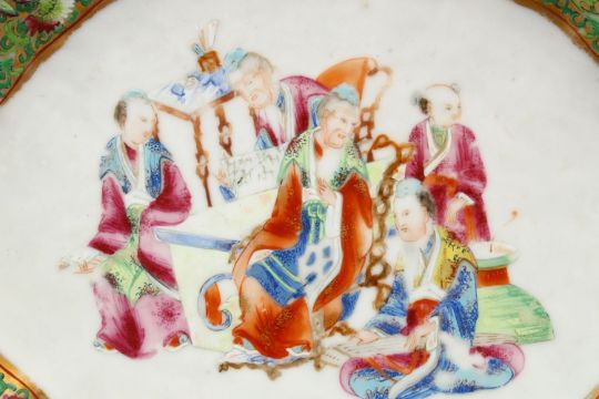 AN UNUSUAL 19TH CENTURY CHINESE CANTON FAMILLE ROSE PORCELAIN DRAGON DISH, the central panel decorated with seated figures, further decorated with panels of dragon borders, 28cm