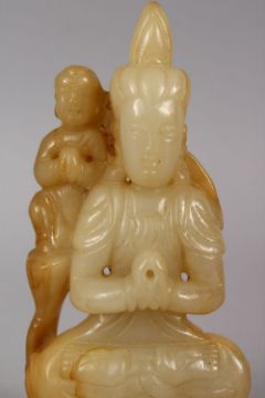 A GOOD CHINESE CARVED JADE FIGURE OF A BUDDHA WITH CHILD, 13cm high.