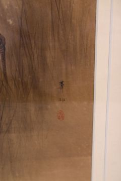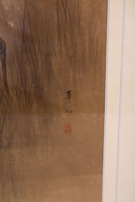 A FINE QUALITY JAPANESE MEIJI PERIOD PAINTING ON SILK OF A BIRD AMONGST REED, the detailed bird leaning forward amongst a simplistic spray of reed, signed "kason" and sealed "Kouson" , framed 64cm x 67cm