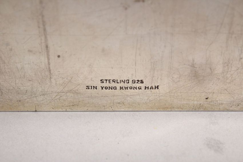 A GOOD 19TH CENTURY CHINESE SOLID SILVER LIDDED EUROPEAN DOG BOX, the box with a European subject dog, the base with a sterling mark and makers mark " sin yong kwong hah", 13.5cm x 8cm.