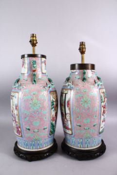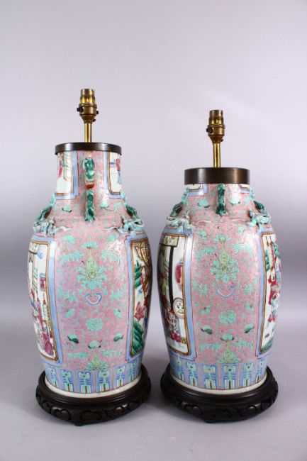A GOOD PAIR OF 19TH CENTURY CANTON CHINESE FAMILLE ROSE PORCELAIN VASES, the body with a pink ground with panel decoration of figures at procession in native landscapes, further decorated with scrolling fruit and foliage, moulded chilong and lion dogs, fitted to hardwood carved bases for lamps, ( tops ground) 47cm high & 43cm.