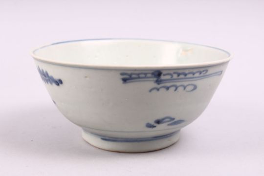 AN EARLY CHINESE BLUE & WHITE PORCELAIN SHIPWRECK BOWL, part of the shipwreck 1999, body with decoration of boys in landscapes, 17cm.