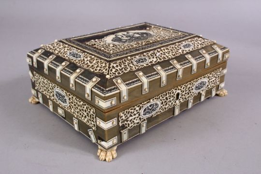 A 19TH CENTURY ANGLO INDIAN HORN & IVORY BOX, with carved ivory openwork on horn, with incised and stained decoration of elephants and deity, on four carved ivory feet, 21cm wide x 15cm deep.