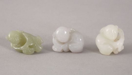 THREE 19TH / 20TH CENTURY CHINESE CARVED WHITE / CELADON JADE FIGURES - BOYS, the carving depicting a boy recumbent holding a lotus branch, 2.3cm - 3cm. (3)