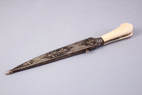 AN EARLY 20TH CENTURY INDIAN IVORY HILTED DAGGER, with silver inlaid Damascus fish hook blade in a niello scabbard, 25cm long.