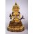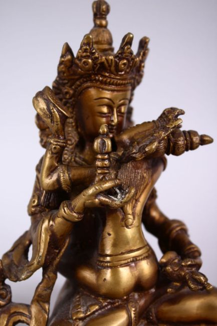 THREE TIBETAN GILT BRONZE FIGURES, each with varying pose, the smallest with poly chrome decoration, impressed mark to base, 10cm, one gilt bronze with legs and arms crossed, possibly 18th century, 13cm, and one larger gilt bronze erotic bronze figure, 17cm. (3)