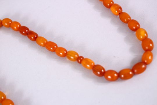 A FINE SET OF CHINESE QING DYNASTY CARVED AMBER BEAD NECKLACE / ROSARY BEADS, comprising 65 carved beads on a green tassel set with a carved amber toggle, approx length open. 70cm
