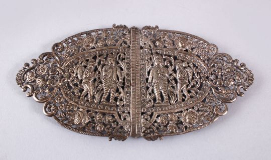 A GOOD INDIAN SILVER BUCKLE, with figures and foliage, 15cm
