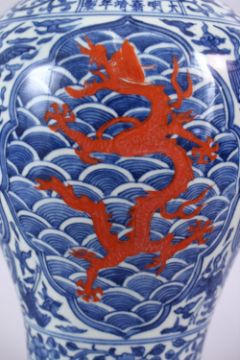 A CHINESE MING STYLE IRON RED & UNDERGLAZE BLUE MEIPING PORCELAIN DRAGON VASE, decorated in iron red with dragons amongst panels of waves, with blue phoenix birds, base unglazed, 36cm high.