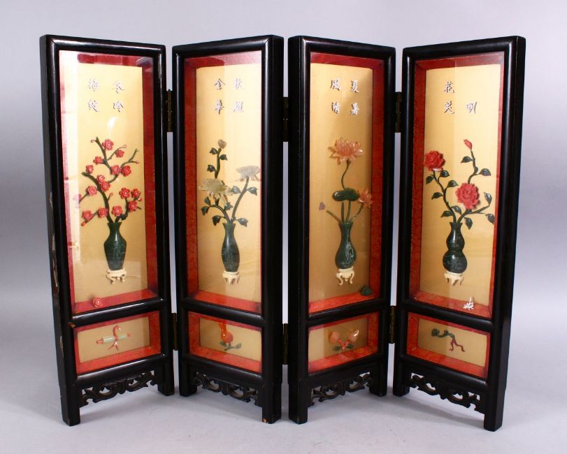 A GOOD CHINESE FOUR FOLD HARDSTONE INLAID SCREEN, each panel inlaid and glazed depicting a native view of flora, each section 46cm x 15cm.