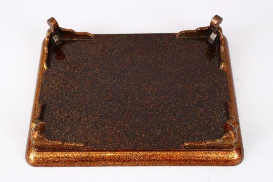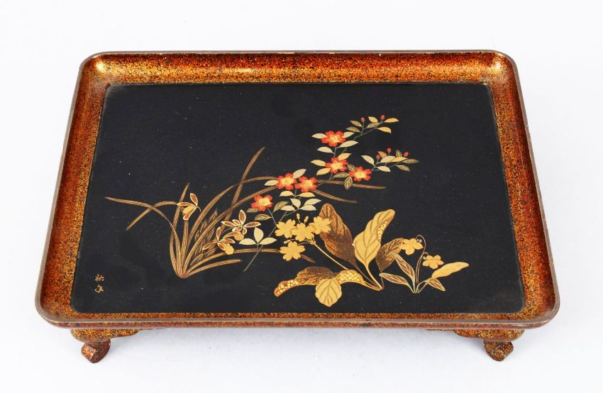 A GOOD JAPANESE MEIJI PERIOD LACQUER TRAY ON FEET, the tray decorated with scenes of native flora, stood on four curving decorated feet, artist signed lower left, 7cm high x 29cm wide x 22.5cm deep.