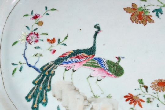 A LARGER 18TH CENTURY CHINESE FAMILLE ROSE PORCELAIN SERVING DISHS, decorated with scenes of peacocks amongst native floral displays, with formal scrolling floral border, 44.5cm wide x 37cm deep.