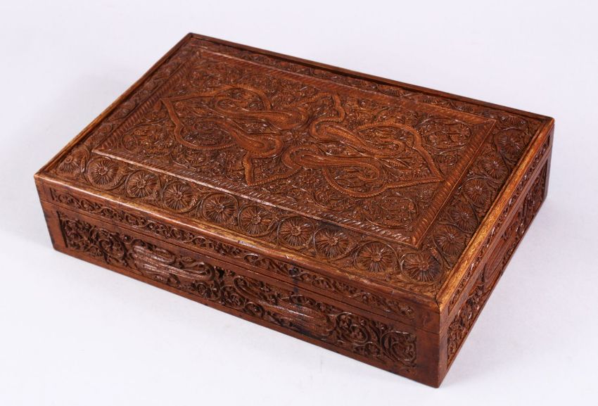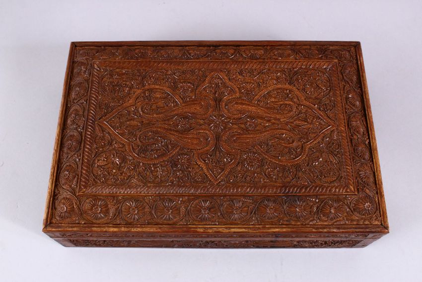 A GOOD 19TH / 20TH CENTURY INDIAN CARVED WOODEN LIDDED BOX, 31cm x 20cm.