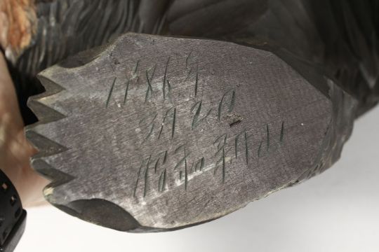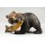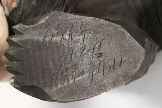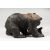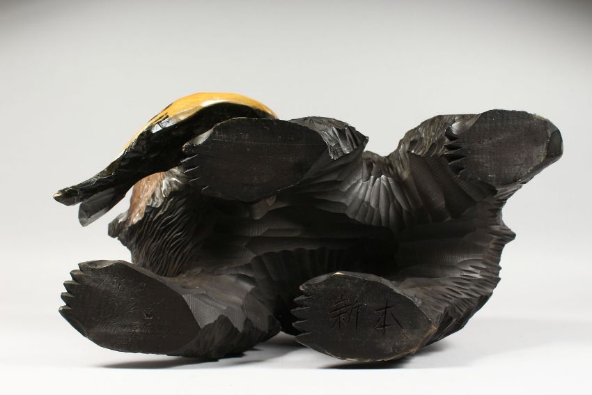 A LARGE JAPANESE KIBORI KUBA CARVED WOODEN FIGURE OF A BEAR, the bear in striding position with a fish in its mouth, 27cm high x 45cm wide, with inscriptions and signature to two feet.