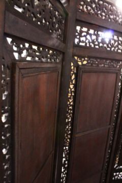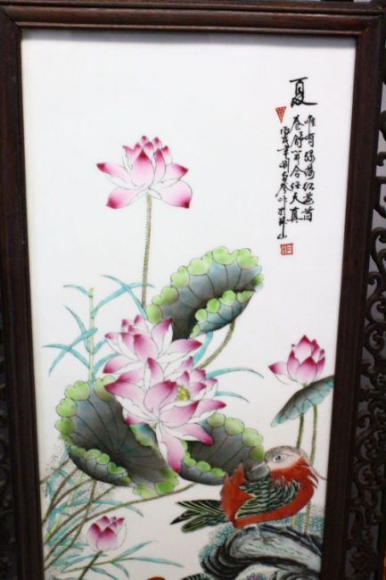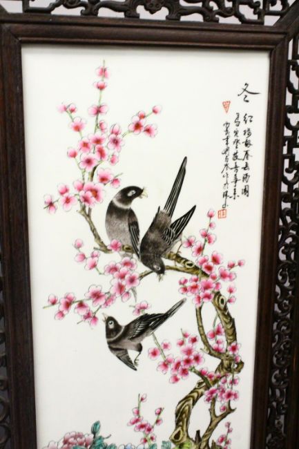 A LARGE & HEAVY CHINESE REPUBLIC STYLE FOUR FOLD PORCELAIN PANEL SCREEN, each section of the screen with an inset porcelain plaque, each panel with a varied species of native birds, amongst native flora, each plaque artist signed to the upper left and right sections, with seals, the wooden frame with openwork frieze, the upper openwork section carved with dragons and pearls, each section measuring: 51cm wide x 188cm high.